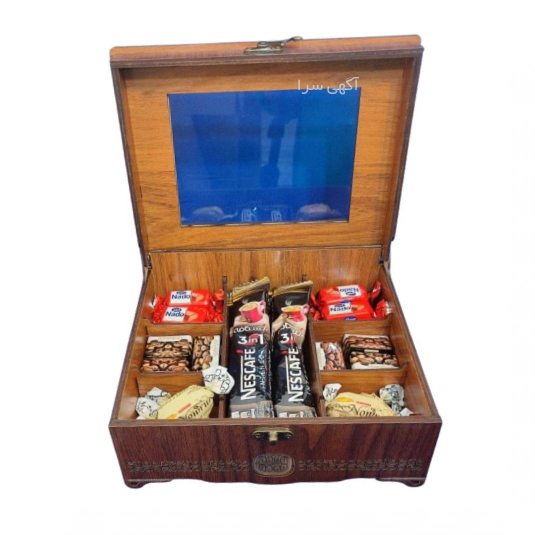 محتویات جعبه شکلات نادو : 120 گرم شکلات نوروز : 120 گرم شکلات قهوه : 120 گرم نسکافه : 6 عدد - 130 گرم ابعاد جعبه : 17*21* 9 وزن جعبه : 620 گرم وزن کامل : 1110 گرم تولید با بهترین قیمت و کیفیت آجیل کادویی جعبه چوبی جهت دریافت قیمت همکاری و فروش سازمانی باما درتماس باشید