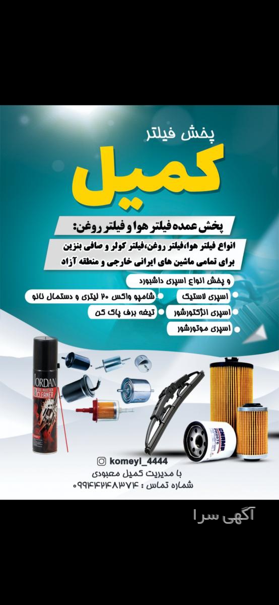 پخش عمده انواع فیلتر هوا ، فیلتر روغن ،فیلتر کابین و صافی بنزین برای کلیه ماشین های ایرانی و خارجی و همچنین پخش انواع اسپری لاستیک،داشبورد و انژکتور با قیمت عمده در خدمت شما هستیم.