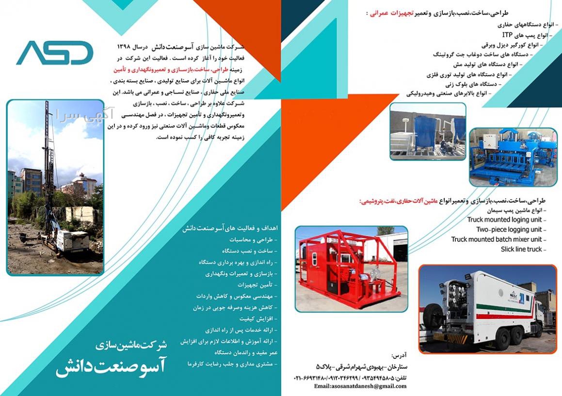 شرکت ماشین سازی آسو صنعت دانش با شماره ثبت 623549 درسال 1390 فعالیت خود را آغاز کرده است .فعالیت شرکت آسو صنعت دانش در ضمینه طراحی، ساخت،بازسازی و تعمیرونگهداری و تأمین انواع ماشین آلات برای صنایع تولیدی ، صنایع بسته بندی ، صنایع ملی حفاری ، صنایع نساجی و عمرانی می باشد. این شرکت علاوه بر طراحی ، ساخت ، نصب ، بازسازی وتعمیرونگهداری و تأمین تجهیزات ، در فصل مهندسی معکوس قطعات وماشین آلات صنعتی نیز ورود کرده و در این زمینه تجربه کافی را کسب نموده است.