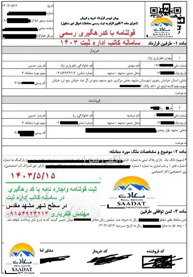 ثبت صدور قولنامه و اجاره نامه با کدرهگیری در سامانه کاتب در مشهد برای تمام املاک از سند رسمی تا املاک با اسناد عادی *