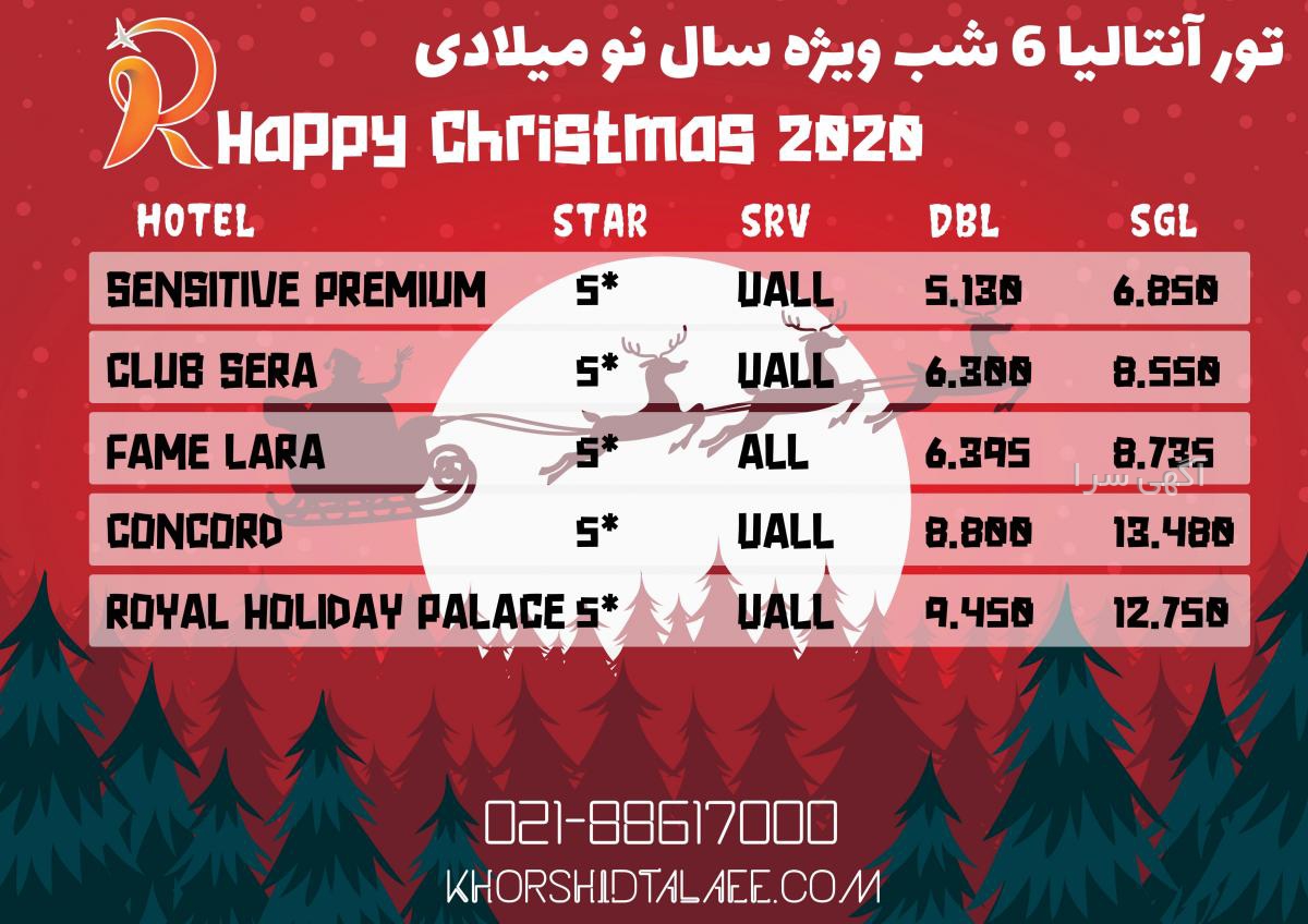 خدمات : بلیط رفت و برگشت با پروا زماهان ایر، لیدر فارسی زبان ، بیمه مسافرتی ، ترانسفر فرودگاهی ، برنامه های ویژه در هتل ها در شب کریسمس