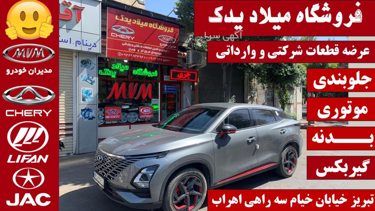 *****فروشگاه میلاد یدک**** فروش تمامی قطعات ( شرکتی و وارداتی ) ام وی ام و چری اعم از جلوبندی - بـدنه ( چراغ های جلو و عقب ، تمامی زه های درب و دور گلگیر ، سپر های جلو و عقب ، دیلایت - مه شکن - تورس سپر و ....) موتوری - گیربکس - کمک فنر ها و همه و همه در فروشگاه میلاد یدک تبریز با ارسال سریع به سراسر کشور در کمترین زمان