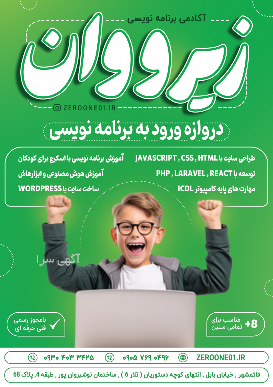 آموزشگاه برنامهنویسی زیرو وان (Zero One) یک مرکز آموزشی معتبر در قائمشهر، مازندران است که دورههای برنامهنویسی و فناوری اطلاعات را برای کودکان و نوجوانان ارائه میدهد.