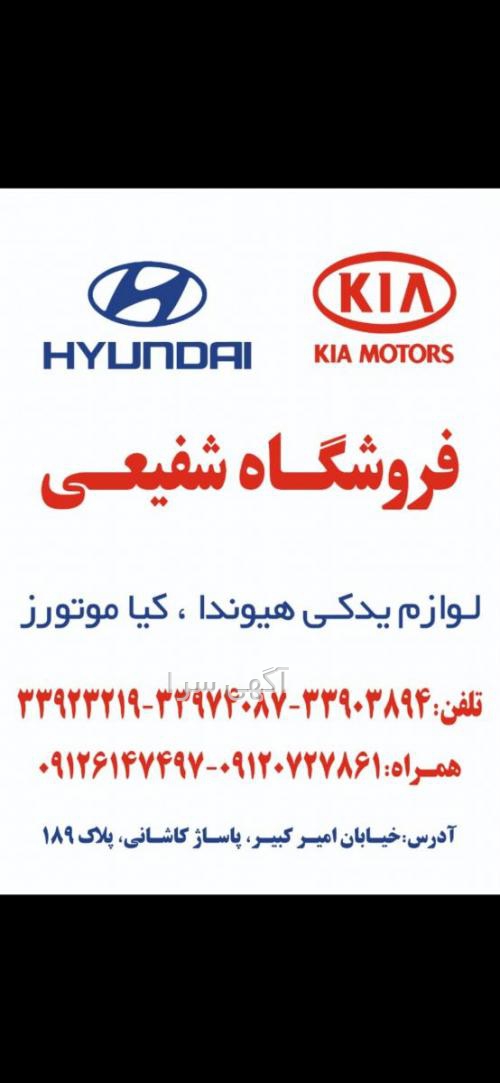 فروشگاه شفیعی عرضه کننده کلیه قطعات یدکی خودروهای هیوندا و کیا شامل : سفت کن تایم ف دستگیره درب ، کشویی سپر جلو ، لنت ترمز ، رینگ موتور ، فیلتر بنزین ، دیسک چرخ ، کمک فنر ، سیبک طبق جلو ، سیبک موجگیر جلو ، پلوس ، جعبه فرمان ، سیبک فرمان ، چراغ جلو ، دیاق ،جلو پنجره ، فوم سپر ، گلگیر ، درب موتور ف پرژکتور ، چراغ خطر ف فلاب ، ریش سپر ، توری سپر ، دیاق ، لاستیک و ...