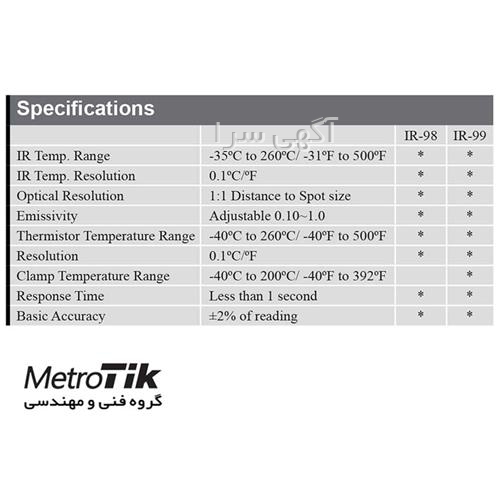 دماسنج آشپزی میله ای CEM IR_98 می تواند دمای مواد غذایی را به صورت تماسی و غیر تماسی اندازه گیری کند. محدوده اندازه گیری دما با استفاده از دماسنج مادون قرمز از 35- تا 260+ درجه سانتی گراد با رزولوشن 0.1 درجه سانتی می باشد. علاوه بر اندازه گیری از راه دور می توانید اندازه گیری های دقیق و حساس را با استفاده از پراب میله ای نفوذی انجام داد.