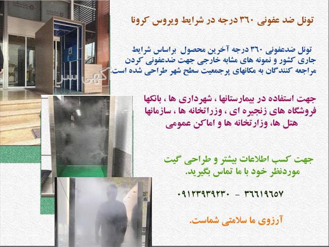 گیت ضدعفونی کننده برای ورودیهای پرسنل و مراجعین به بیمارستانها و بانکها و فضاهای عمومی وغیره . مقابله با ویروس کرونا . توسط پمپ مناسب و نازلهای مهپاشی .