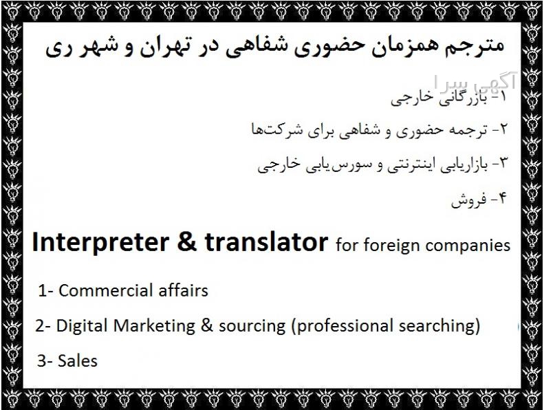 مترجم حضوری مترجم ترجمه پیاپی و مترجم ترجمه شفاهی در تهران با سابقه کار با افراد و شرکت های خارجی در آسیا ، استرالیا ، اروپا و آمریکا .