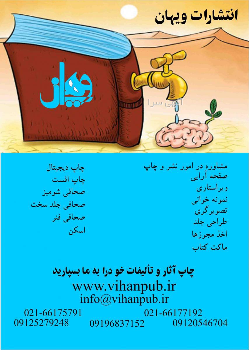 انتشارات ویهان با سابقه فعالیت گسترده در حوزه چاپ وتکثیر،خدمات صحافی و چاپ کتاب شامل ویراستاری، صفحهآرایی، طراحی جلد، تایپ فارسی، ترجمه انگلیسی، تبدیل پایاننامه به کتاب با قیمت مناسب، کاملا حرفهای، تخصصی و مورد رضایت شما.