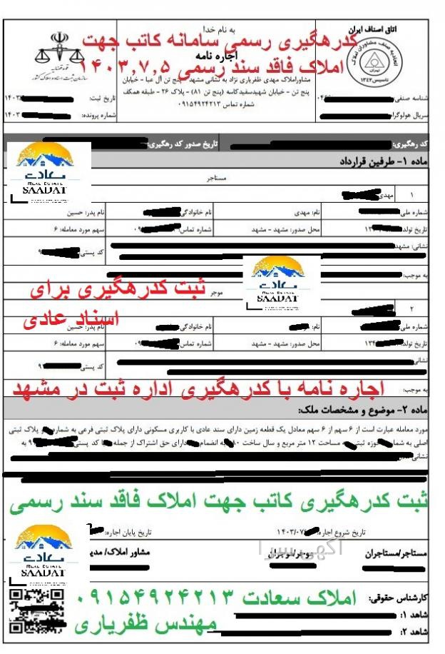 ثبت قولنامه و اجاره نامه با کدرهگیری در مشهد