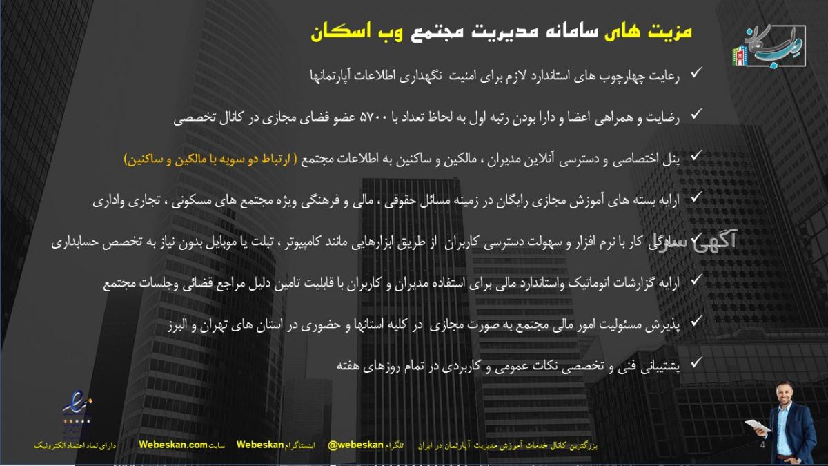 ارایه بسته های آموزش مجازی رایگان در زمینه مسائل حقوقی ، مالی و فرهنگی ویژه مجتمع های مسکونی ، تجاری واداری