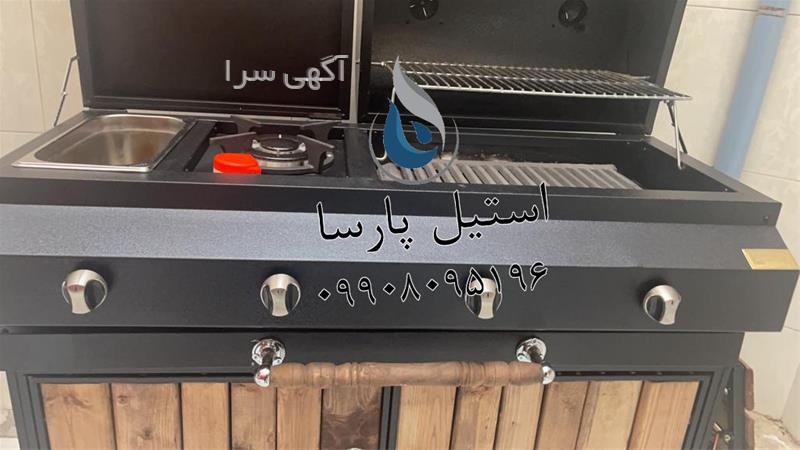 باربیکیو استیل نقره ای دارای میز بغل و کابینت، ساخته شده از استیل مرغوب مناسب استفاده از باریکیو باغ ویلا، قابلیت سفارش در ابعاد دلخواه