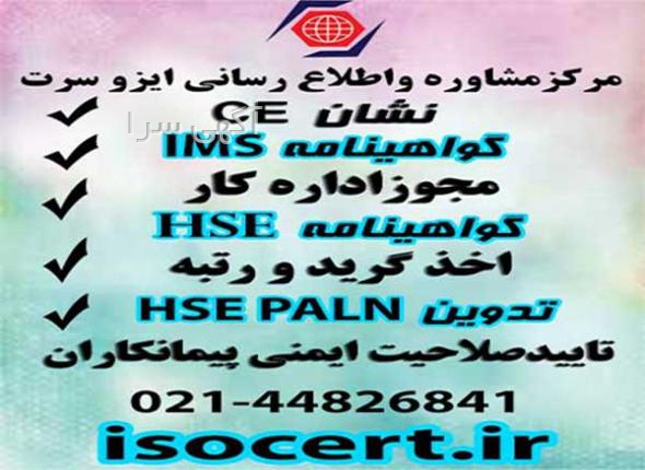 گواهینامه iso ، گواهی نامه ایزو ارزان ، iso رایگان ، گواهینامه HSE ، مدرک اموزشی HSE ، گواهینامه CE ، نشان CE ، مدرک HSE ، گواهی نامه ISO ، مجوزاداره کار ،تایید صلاحیت ایمنی ، استاندارد CE ، گواهینامه ISO ،انواع گواهینامه های جهانی رامیتوانیدباقیمتهای مناسب وباکیفیت بالا ازشرکت صادر کننده معتبر گواهینامه بین المللی وداخلی ایزو سرت تهییه بفرماییدوهمچنین ازتخفیفات فصلی واستثنایی ماباقیمتهایی با50درصدتخفیف وجشنواره هایی همراه با اخذ iso ،رایگان وهمچنین استفاده رایگان ازمشاوران iso باسابقه شرکت ایزو سرت درجهت اخذ بهترین گواهینامه برای صنعت وحرفه خودتان بهره مندشوید