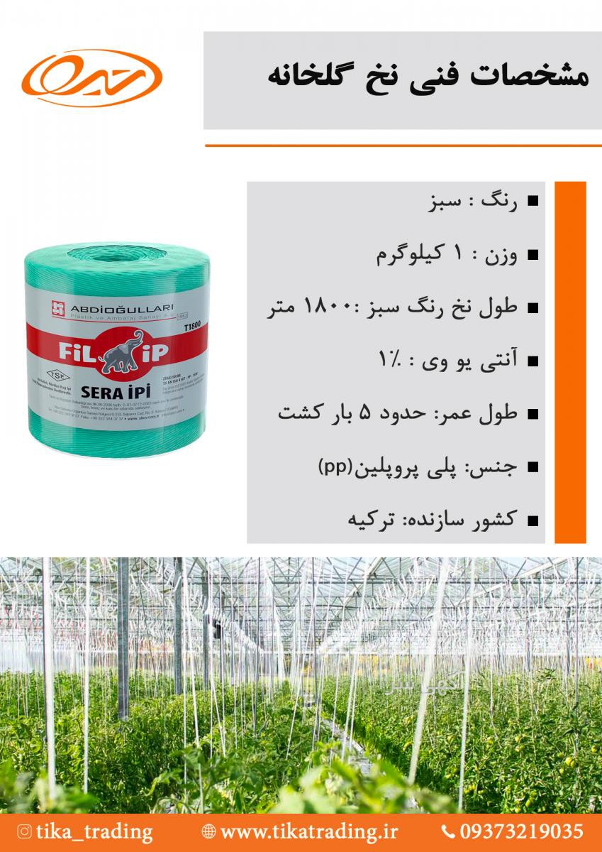 نخ گلخانه یا نخ مخصوص گلخانه با افزودنی آنتی یووی تولید شده و به منظور بالا نگه داشتن بوتهها در گلخانه و جلوگیری از افتادگی آنها استفاده میشود. نخ گلخانه برای محصولاتی نظیر فلفل، گوجه، خیار و سایر صیفیجات و همچنین برای تمام گیاهانی که به شکل بوته هستند و وزن محصول باعث افتادگی آنها میشود کاربرد دارد. ضمنا با استفاده از این نخ میتوان تعداد بیشتری بوته را در گلخانه پرورش داد و از فضای گلخانه به شکل بهینه استفاده کرد.