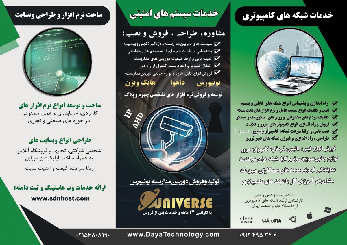 شرکت دایا فناوری راه ابریشم ( گروه بروزسافت ) به شماره ثبت 548985 با سالها تجربه و دارا بودن تیم متخصص در زمینه مشاوره، طراحی ، فروش و نصب سیستم های حفاظتی و امنیتی دوربین مداربسته ، دزدگیر و اعلان حریق برای شرکت ها و کارخانجات صنعتی و تجاری در بخش های زیر آماده ارائه خدمات زیر با کیفیت عالی میباشد: