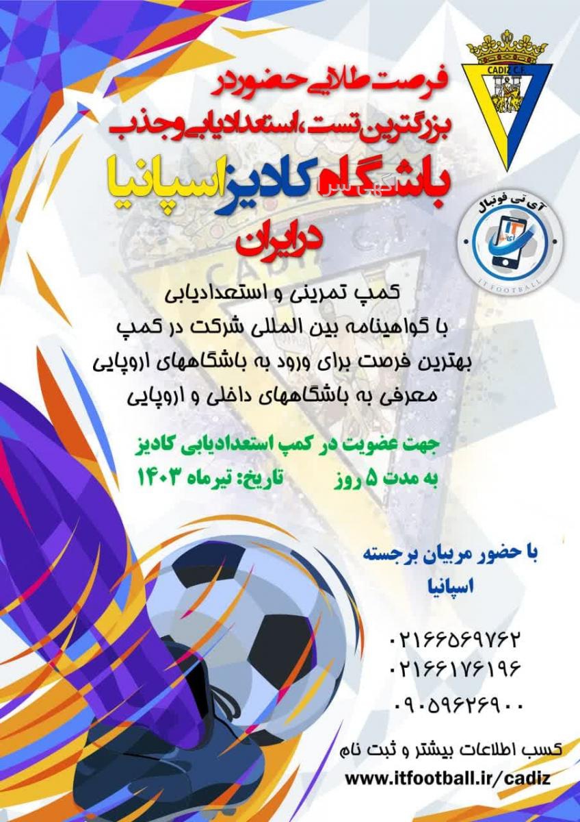 کمپ استعدادیابی و جذب بازیکن رده های سنی مختلف فوتبال با حضور مدیر و مربیان آکادمی کادیز اسپانیا از تیر ماه 1403 برگزار می گردد.