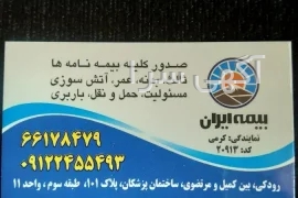صدور انواع بیمه نامه اتومبیل(ثالث -بدنه)-صدور بیمه نامه مهندسی-بیمه آتش سوزی کارخانجات صنعتی -انبارها-کارگاه ها-بیمه آتش سوزی منازل مسکونی-طرح حامی-بیمه عمر و سرمایه گذاری و طرح مان-بیمه مسئولیت کارفرما-بیمه مسئولیت ساختمان درحال احداث-بیمه مهندسی-بیمه مهد کودک ها - بیمه ایران، 09122... [نمایش کامل] ,رودکی جنوبی پلاک