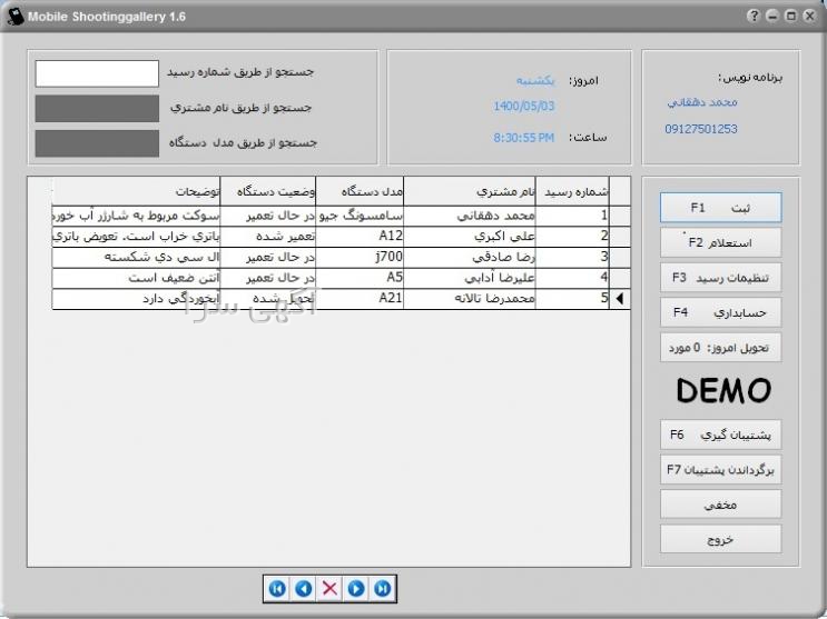 نرم افزار مدیریت تعمیرگاه جهت سهولت کار در تعمیرگاهها از جمله تلفن همراه و کامپیوتر و … طراحی و پیاده سازی شده است.