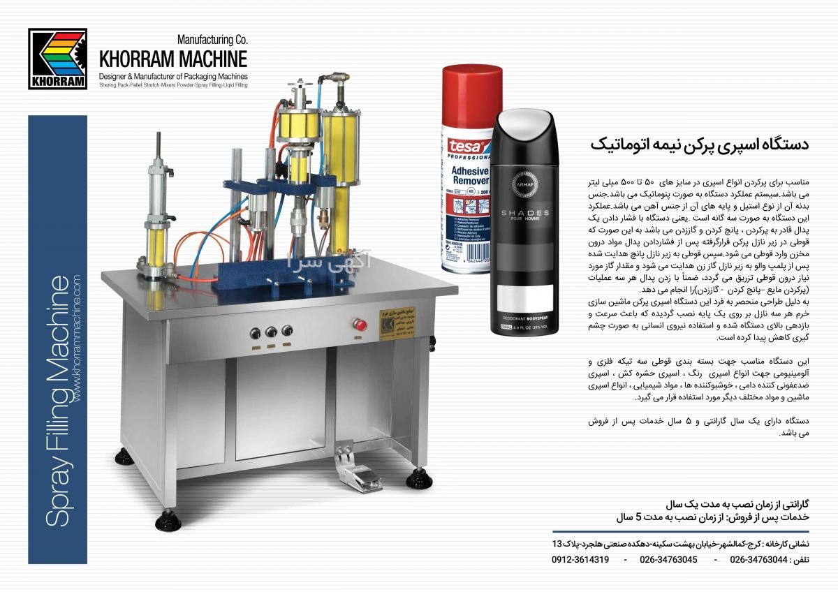 مناسب برای پرکردن انواع اسپری در سایزهای 50 تا 500 میلی متر را دارا می باشد.سیستم عملکرد دستگاه به صورت پنوماتیک می باشد.جنس بدنه آن از نوع استیل و پایه های آن از جنس آهن می باشد.عمکلرد این دستگاه به صورت سه گانه می باشد یعنی دستگاه با فشار دادان یک پدال قادر به پرکردن، پانچ کردن و گاز زدن می باشد به این صورت که قوطی در زیر نازل پرکن قرار گرفته پس از فشار دادان پدال مواد درون مخزن وارد قوطی می شود.سپس قوطی به زیر نازل پانج هدایت شده پس از پلمپ والو به زیر نازل گاز زن هدایت می شود و مقدار گاز مورد نیاز درون قوطی تزریق می گردد.