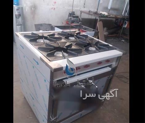 اجاق چهار شعله صنعتی دارای یک سینی آبریز در زیر شعله ها است.