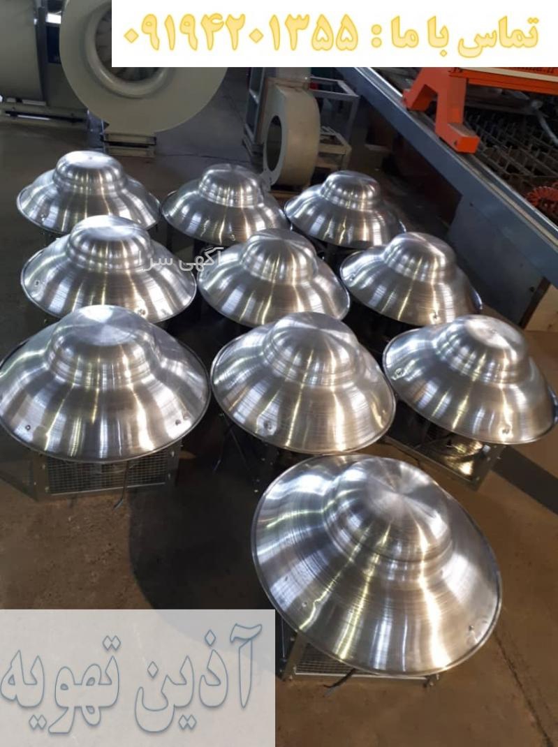 اگزاست فن قارچی آذین تهویه در سایزهای پروانه 25 سانت تا 90 سانت با فن سانتریفیوژ بکوارد و یک کلاهک محافظ تولید می شود.