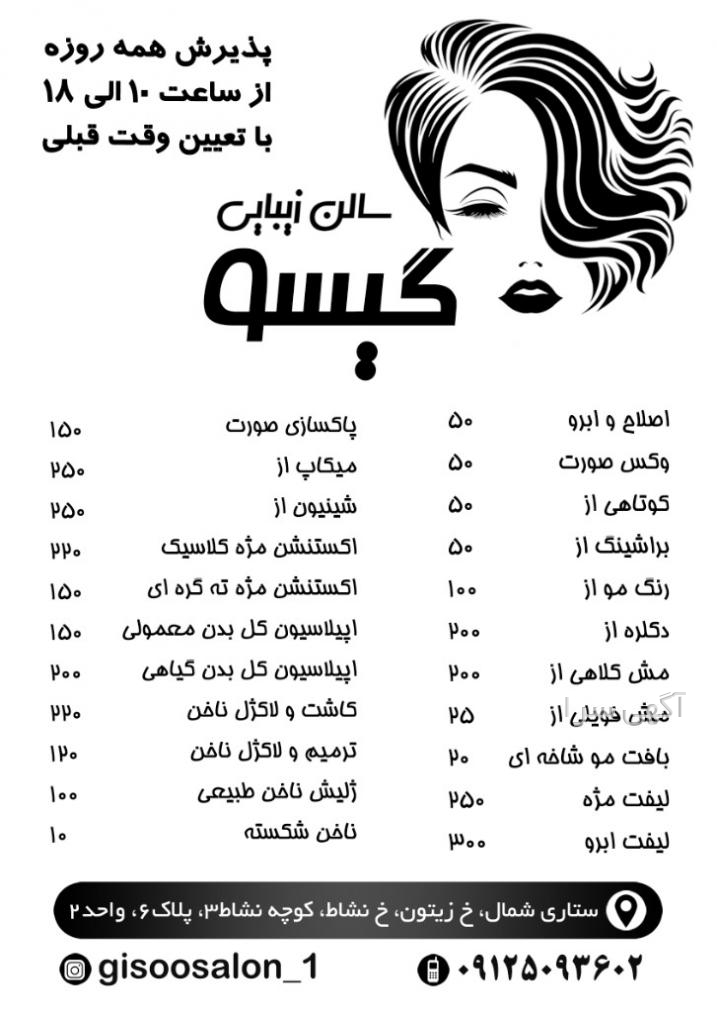 موبایل: ۰۹۱۲۵… تلفن: ۰۲۱۴۴… اینستاگرام: gisoosa… … … ✔️شینیون از ۲۵۰ ✔️اکستنشن مژه کلاسیک ۲۲۰ ✔️اکستنشن مژه ته گره ای ۱۵۰ ✔️اپیلاسیون …اکستنشن مو دیجی