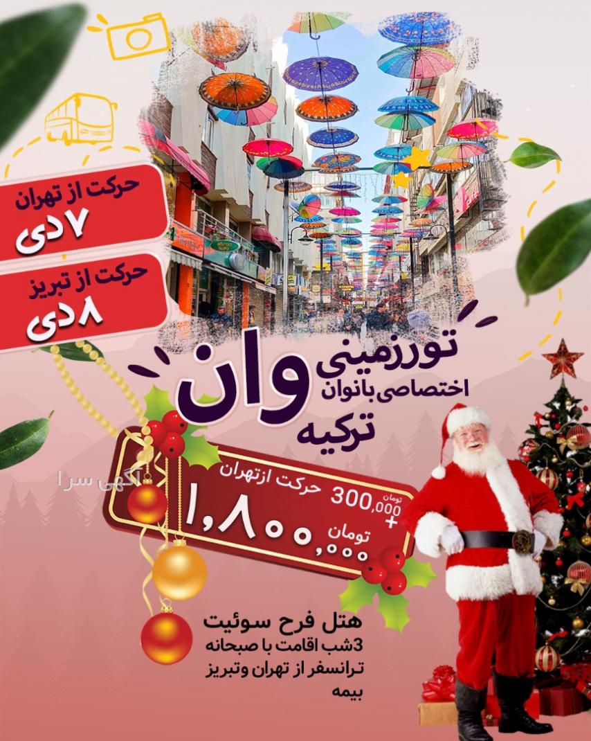 تور زمینی وان ویژه بانوان عزیز سه شب و چهار روز تاریخ حرکت ۷ دی ویژه کریسمس اقامت در هتل سه ستاره فرح بیمه مسافرتی اقامت به همراه صبحانه حرکت از تبریز ۱۸۰۰ حرکت از تهران ۲۱۰۰ اتوبوس وی ای پی ون ترک خانومای عزیز این تور بی نظیر و از دست ندین ۰۹۹۳۹…خدمات تبریز